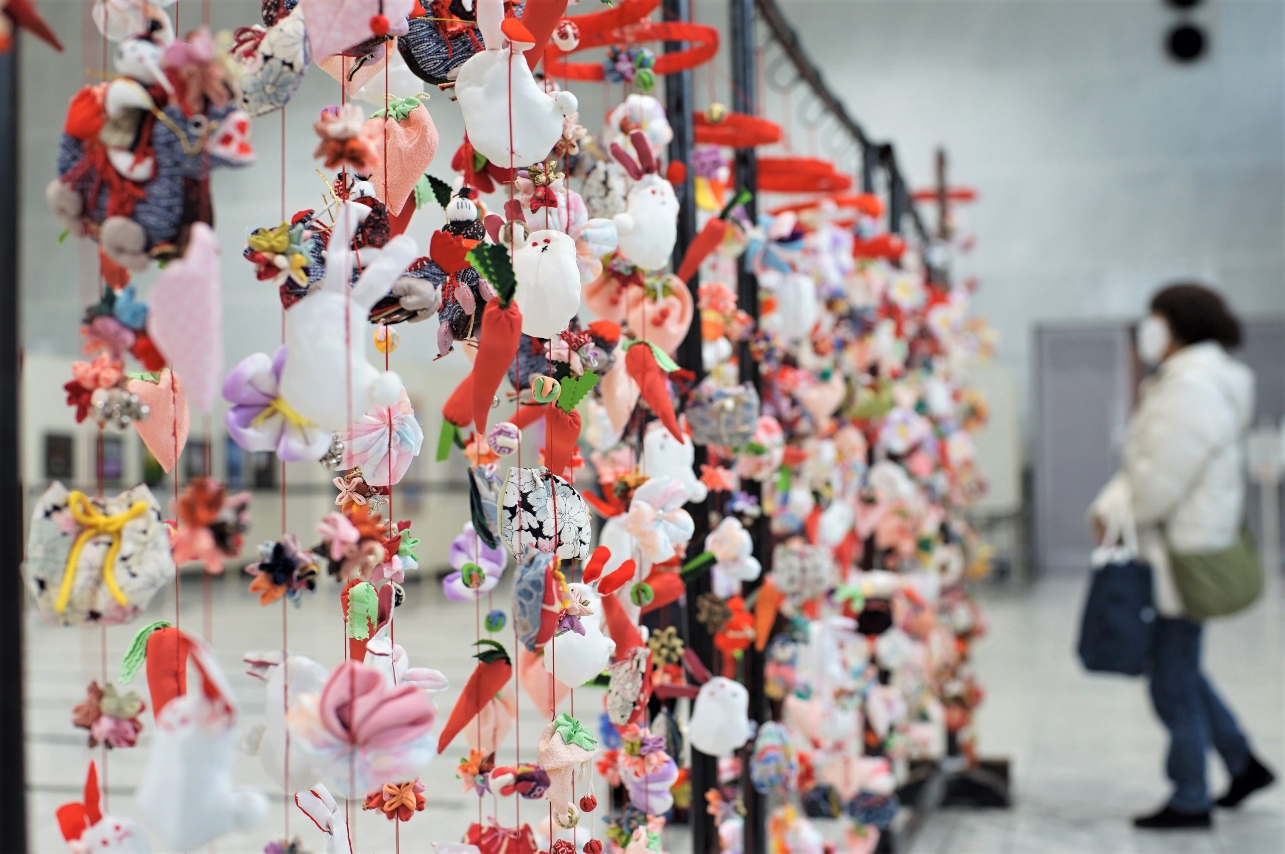 2月5日(月)からの展示を前に、一部の吊り雛が産業文化センターエントランスホールでご覧いただける『ブレ開催』が